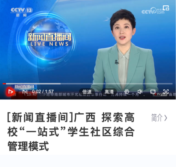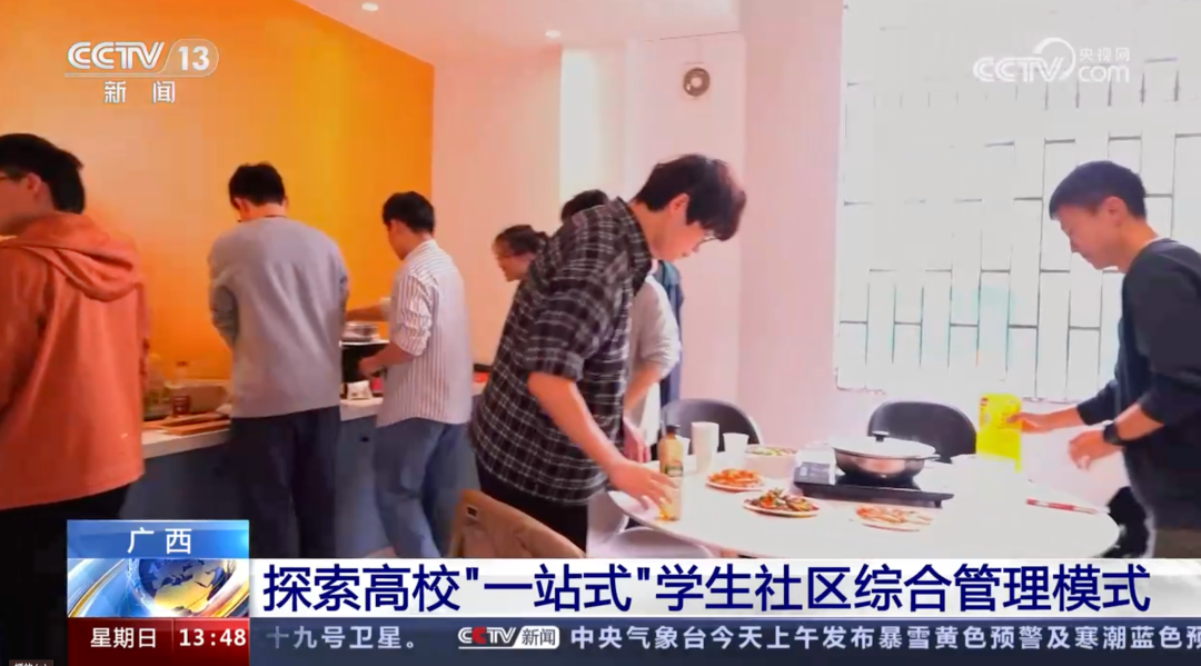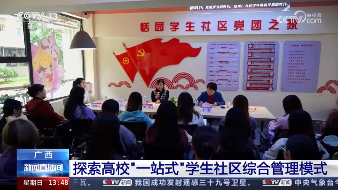 学生社区是高校的基本组成单元,教育部等八部门印发《关于加快构建高校思想政治工作体系的意见》提出:要推动“一站式”学生社区建设,打造思想教育、师生交流、文化活动、生活服务于一体的教育生活园地。在广西,目前已经实现全区高校“一站式”学生社区全覆盖,为学生提供了更加多元的实践、锻炼机会。中央电视台CCTV-13新闻频道《新闻直播间》栏目以《广西 探索高校“一站式”学生社区综合管理模式》为题,报道广西高校“一站式”学生社区建设成果。