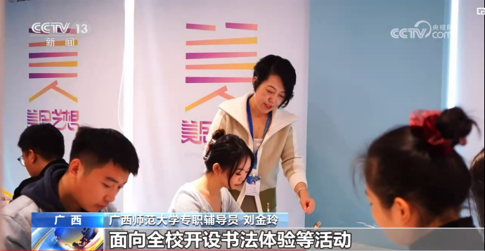 广西师范大学专职辅导员刘金玲老师说:“美术专业的学生作为小指导老师,面向全校开设书法体验等活动,让我们非(艺)术科的学生感受到艺术的熏陶,对于(艺)术科学生本身是提高,可以提升他们教育实践的能力。”