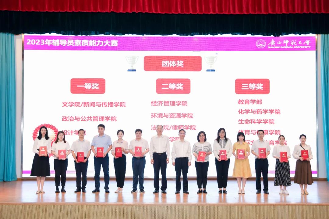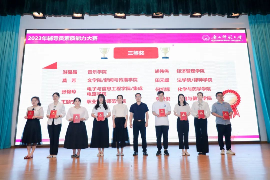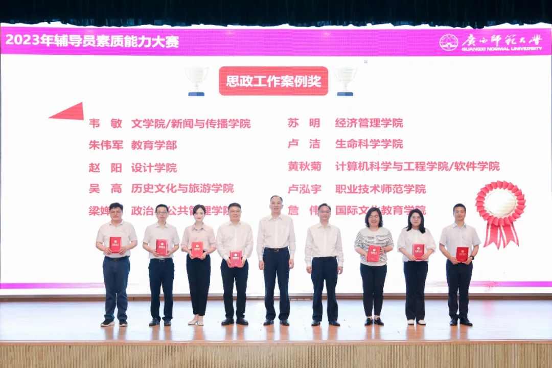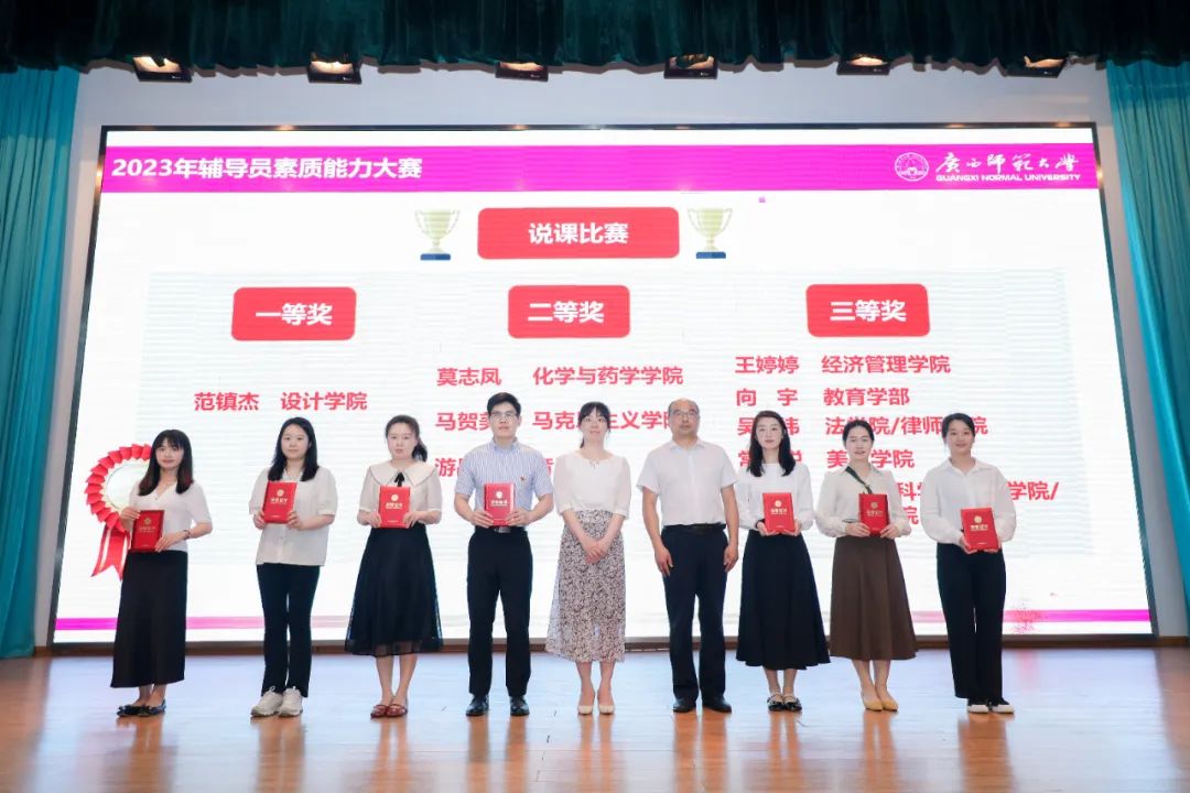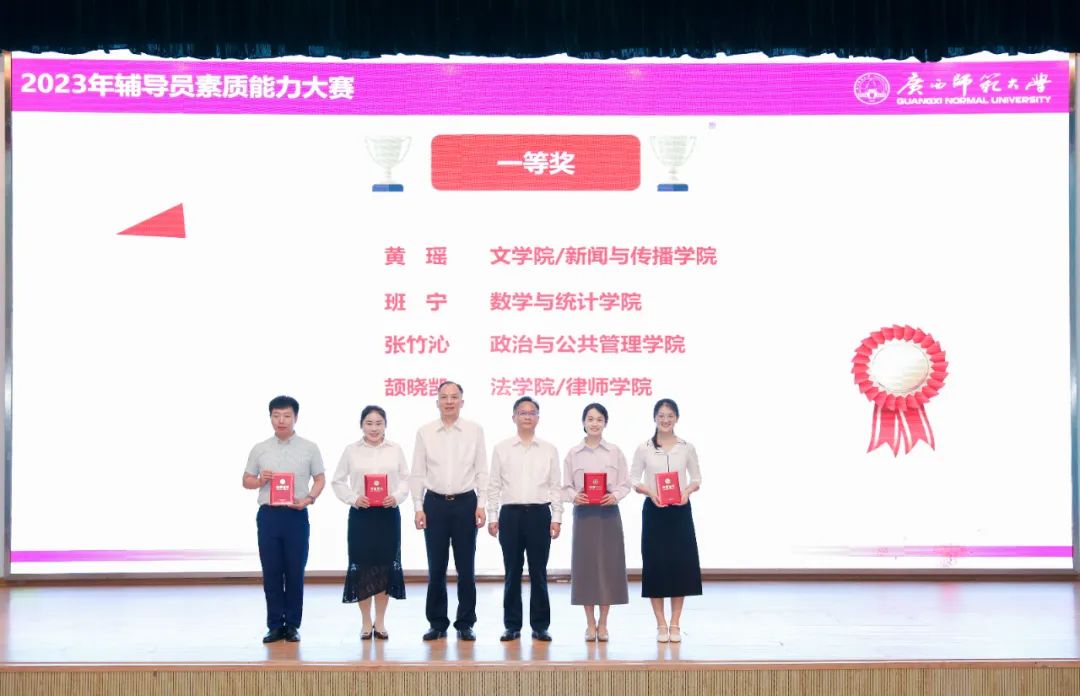 5月26日,广西师范大学学生工作队伍学习贯彻习近平新时代中国特色社会主义思想主题教育辅导报告会暨2023年辅导员素质能力大赛颁奖仪式在田家炳教育书院一楼报告厅举行。校党委副书记旷永青出席颁奖仪式并讲话,校党委常委、副校长林春逸宣读学校2023年辅导员素质能力大赛获奖名单。校领导旷永青、林春逸,学生工作部(处)、党委研究生工作部主要负责人,党委组织部、党委教师工作部/人事处、教务处、研究生院相关负责人为获奖单位和选手颁发荣誉证书。