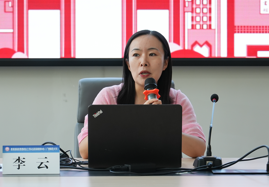 培训期间,玉林师范学院原党委书记、硕士生导师、广西社科联副主席唐仁郭教授,广西师范大学法学院党委书记、硕士生导师窦武,广西师范大学大学生心理健康教育中心副主任欧阳丹,贵州大学经济学院辅导员、全国第十五届“高校辅导员年度人物”李云,广西师范大学美术学院辅导员、全国教育系统先进工作者、全国第十五届“高校辅导员年度人物提名”刘金玲,中南大学辅导员、全国“最美高校辅导员”、全国第十三届“高校辅导员年度人物”连选分别作了专题报告。