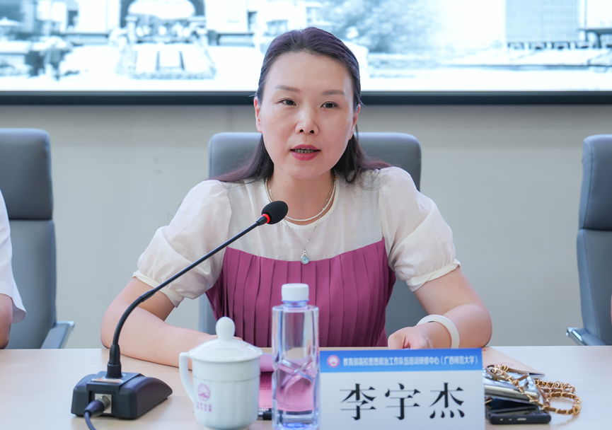 李宇杰介绍了学校及研修中心的基本情况,并对来自广西水利电力职业技术学院的学员们表示热烈欢迎。她表示本次课程在培训内容、师资力量、授课形式等方面进行了精心设置和安排,既有全国最美辅导员面对面讲授、又有革命理想信念教育现场教学和一站式社区建设考察等,最后希望学员在培训期间主动投入、认真学习、深入思考。