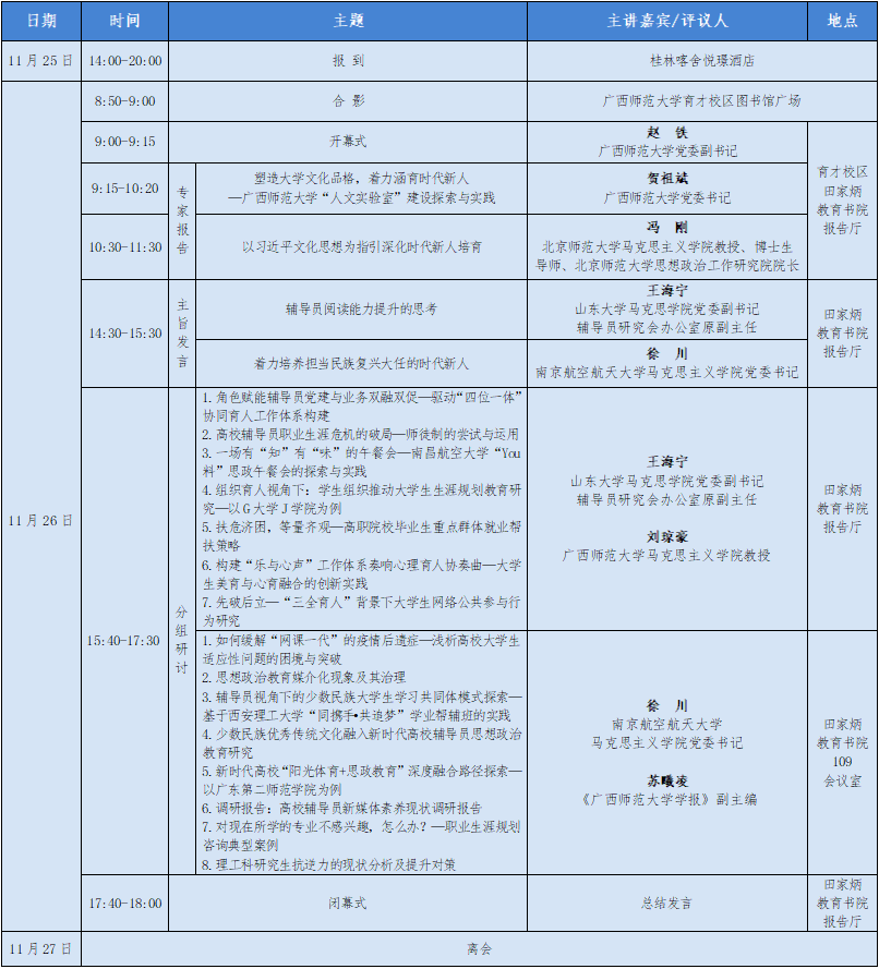 为认真学习宣传贯彻习近平新时代中国特色社会主义思想和党的二十大精神,深入实施“时代新人铸魂工程”,全面提升高校思想政治工作队伍素质能力,切实推动高校思想政治工作高质量发展;搭建辅导员理论研究和工作实践交流平台,帮助辅导员解决工作中的实际问题,推动辅导员队伍职业化专业化发展。高校思想政治工作队伍培训研修中心(广西师范大学)将于2023年11月25日-27日,在广西桂林举办2023年全国“时代新人铸魂育人与辅导员能力提升”主题研讨会。