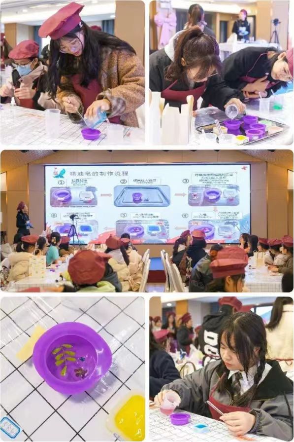 在研学实践基地,同学们沉浸式体验桂花糕DIY制作和桂花精油皂制作过程。同学们动手制作桂花糕,在桂花糕上印上喜欢的图案,感受浓浓的桂花情。在观看完研学导师制作桂花精油皂之后,同学们跃跃一试,制作出一块块精美的桂花精油皂,体验到桂花的独特内质美。