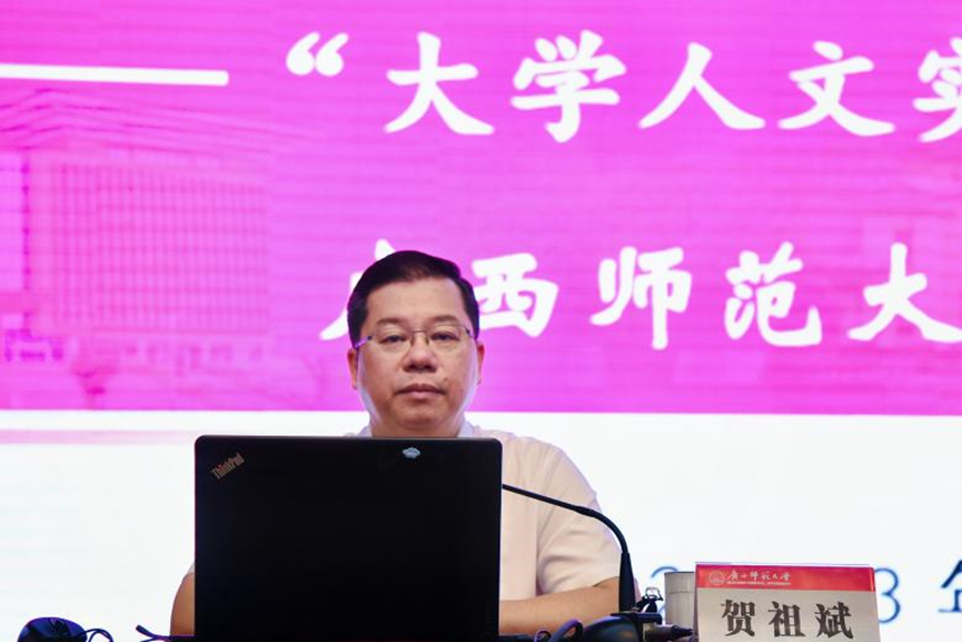 校党委副书记、校长贺祖斌作题为《创设“人文实验室”,加强大学文化建设》的报告。贺祖斌论述了文化对于国家和民族的重要意义,并由此引出文化强国中的大学使命。他对大学文化的内涵与价值进行阐释,并以学校凝练和建设的十大文化景观、十二个博物馆、十二尊石刻、十家咖啡馆为例,详细介绍了“大学人文实验室”的建设理念、建设路径和建设成果。